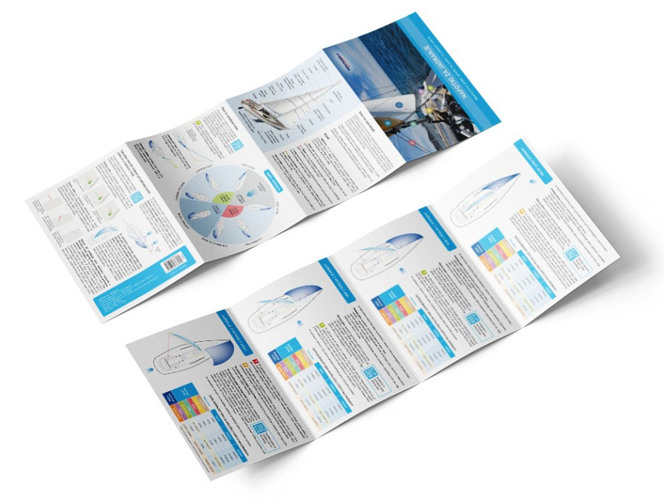 Zgibanka na osmih straneh vsebuje splošne napotke za jadranje in podrobnejše napotke za nastavitev jader glede na smer in jakost vetra.