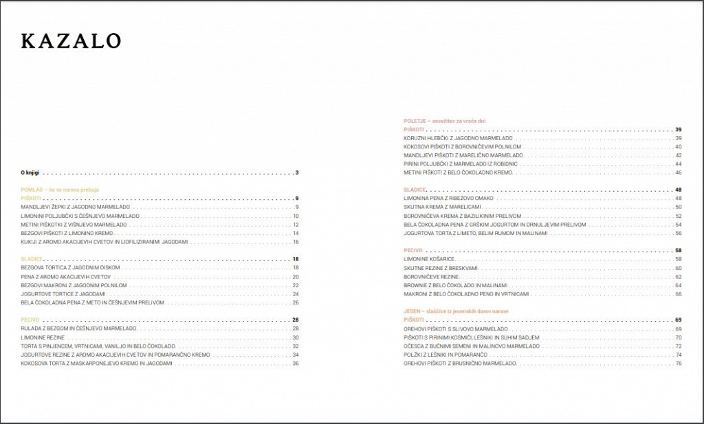 Avtorica se je tokrat sprehodila skozi letne čase in pri pripravi sladic upoštevala, kaj nam najboljšega v določenem obdobju ponuja narava. Recepte za vsak letni čas je nanizala po kategorijah: piškoti, sladice in pecivo. Nekateri recepti so preprosti, za druge je potrebno malo več spretnosti. S krašenjem ni pretiravala. Za okras je uporabila bolj naravne sestavine, kot so koščki sadja, posušeni cvetovi, drobljeni oreščki, nasekljana čokolada …