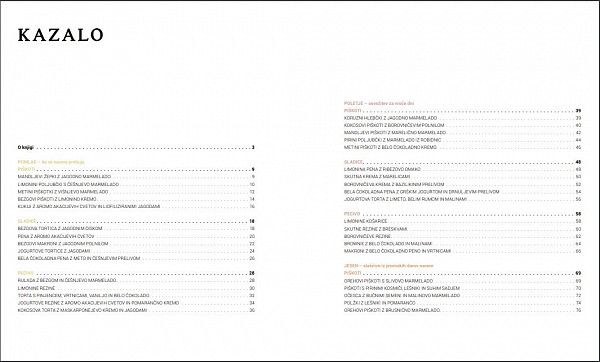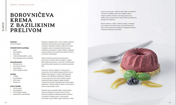 Receptov je 70 in za vsako nedeljo ali pa prazničen dan v letu si lahko izberemo pravega. Poleg sladic nas avtorica nauči tudi pravilne priprave naravnih sirupov, cvetnega prahu in posušenega cvetja za okrasitev sladic.