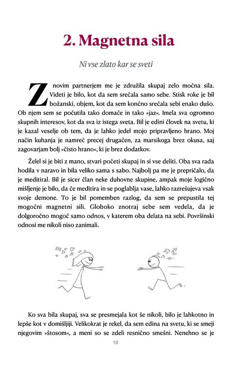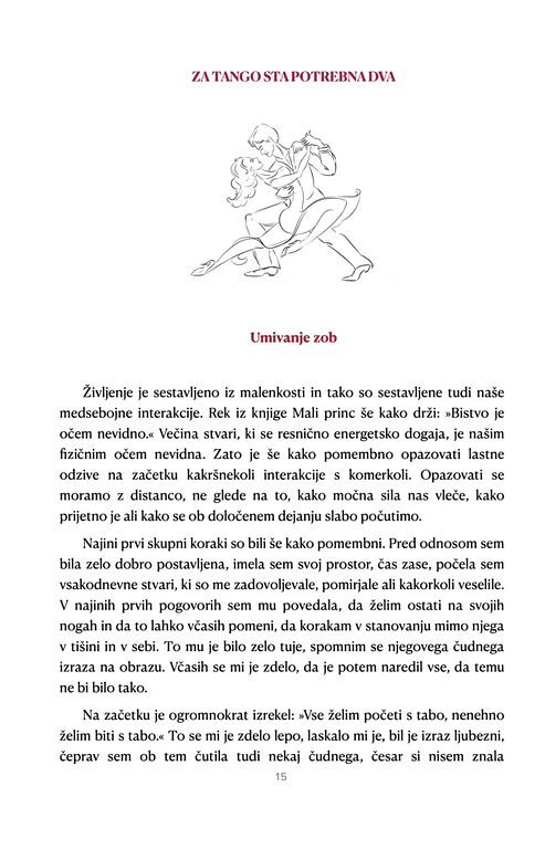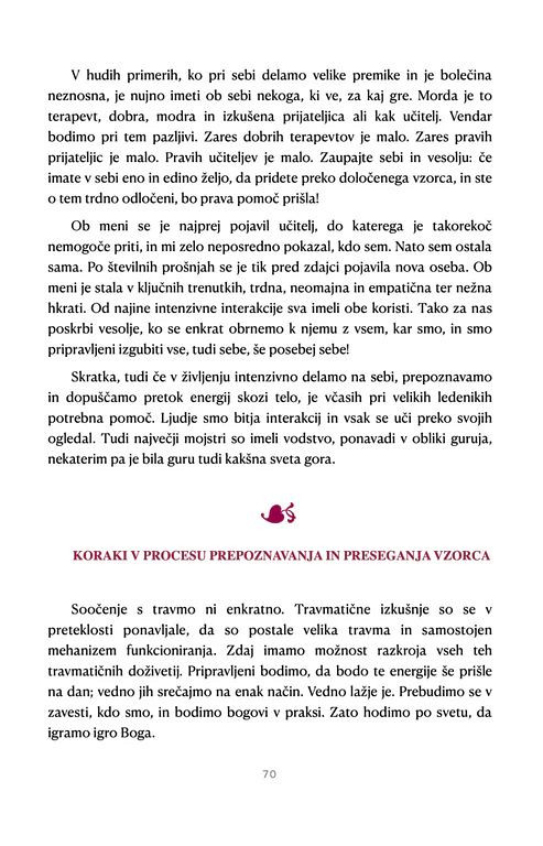 Knjiga razkriva, kako močno so družinske in karmične vezi vtkane v naše odločitve, odnose in občutek lastne vrednosti. Osrednja zgodba odpira prostor za globoko refleksijo, saj nas ne vodi le skozi zunanjo dinamiko odnosov, temveč predvsem v stik z najbolj intimnim in odločilnim odnosom s samim seboj.