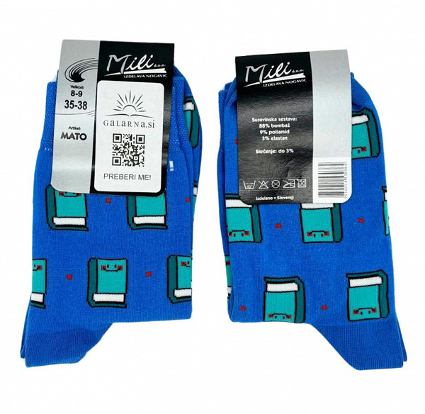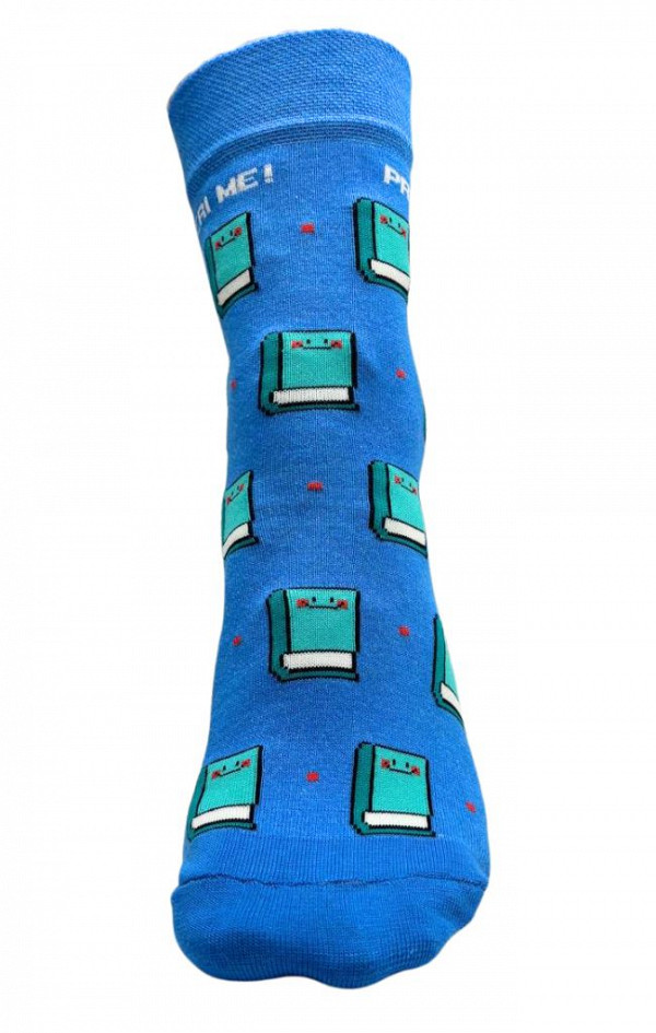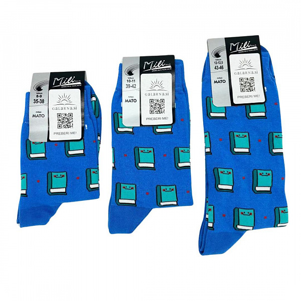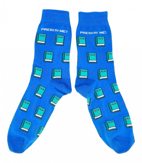 Unikatne nogavice s potiskom. Modra barva s 3D knjigami in napisom "Preberi me".