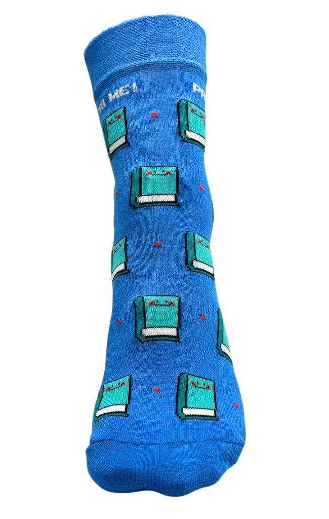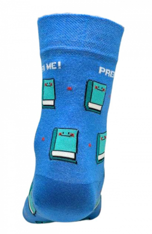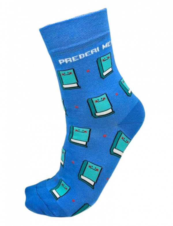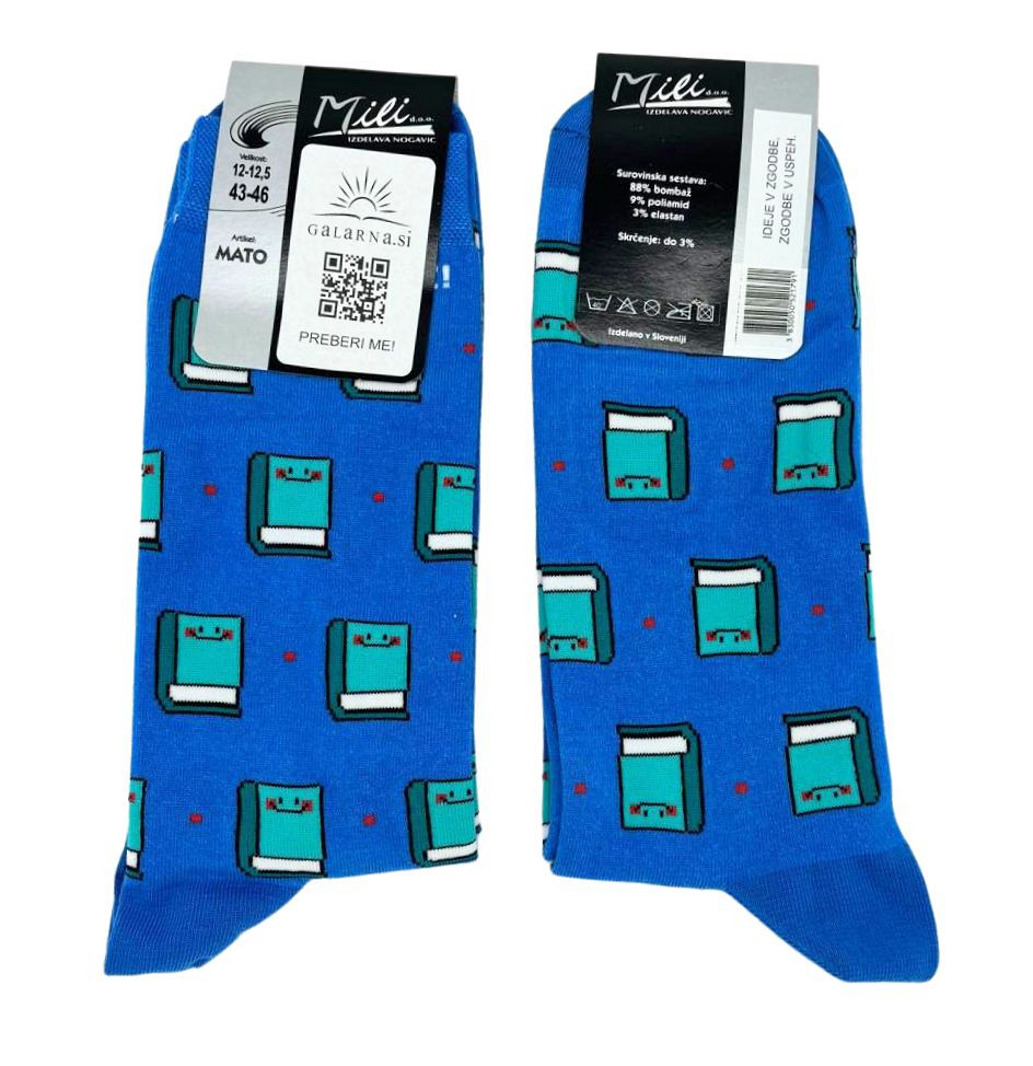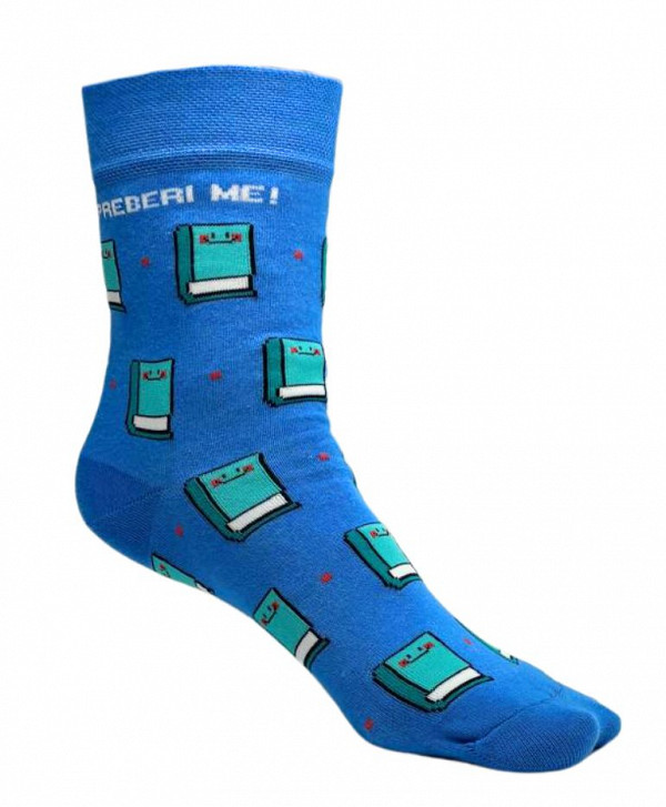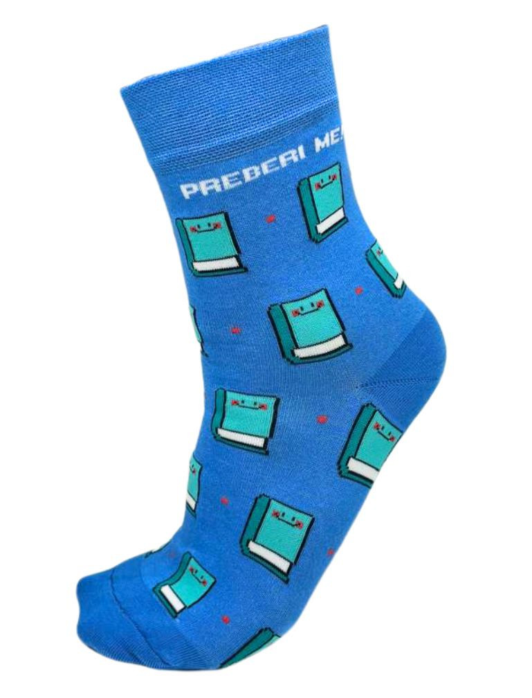 Unikatne nogavice s potiskom. Modra barva s 3D knjigami in napisom "Preberi me".