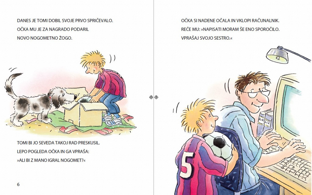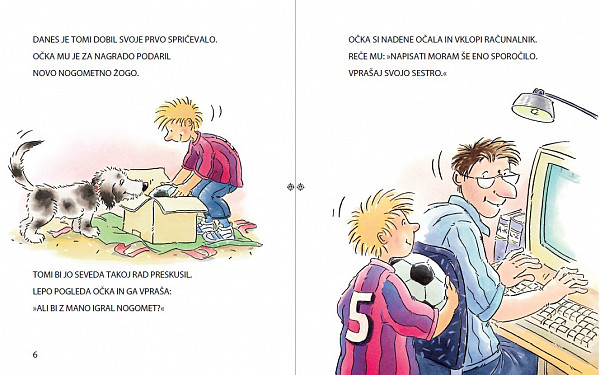 Tomi je dobil svoje prvo spričevalo in očka mu je za nagrado podaril novo nogometno žogo. Tomi bi jo seveda takoj rad preskusil. Kdo bo z njim igral nogomet? Z zvestim pasjim prijateljem se odpravita poiskat soigralce …
