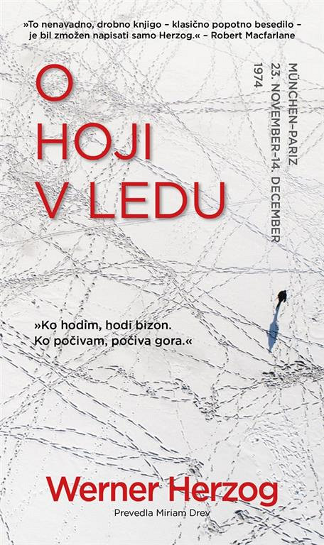 Pred leti, ko si je Herzog še lahko privoščil tudi lastne telesne ekshibicije, je tako nekega dne – bil je v Münchnu – dobil klic, da njegova prijateljica in filmska mentorica Lotte Eisner v Parizu leži na smrt bolna. Herzog je skoraj dobesedno vstal od mize in se nemudoma odpravil na pešpot z notranjo idejo: dokler bom hodil proti njej, bo živela. Dramatični potopis O hoji v ledu je kronološki popis njegovih opažanj in prigod na tej poti: Herzog se tri tedne potepa po neskončni, pogosto neprijazni, blatni, deževni pokrajini, se orientira s priročnim kompasom, spi v obcestnih gostilnah, si hladi žulje in išče hrano ter pijačo, ob tem pa ostroumno secira tako okolico kot sebe. Rezultat je knjiga, iz katere sije bleščeča ideja: človekov duh je neuklonljiv, če si nekaj trdno zapiči v glavo, kar je poanta, ki se je izkazala tudi v Herzogovem najbrž neponovljivem ustvarjalnem opusu. Knjiga za ta (koledarski) čas! (Samo Rugelj, Bukla 158)