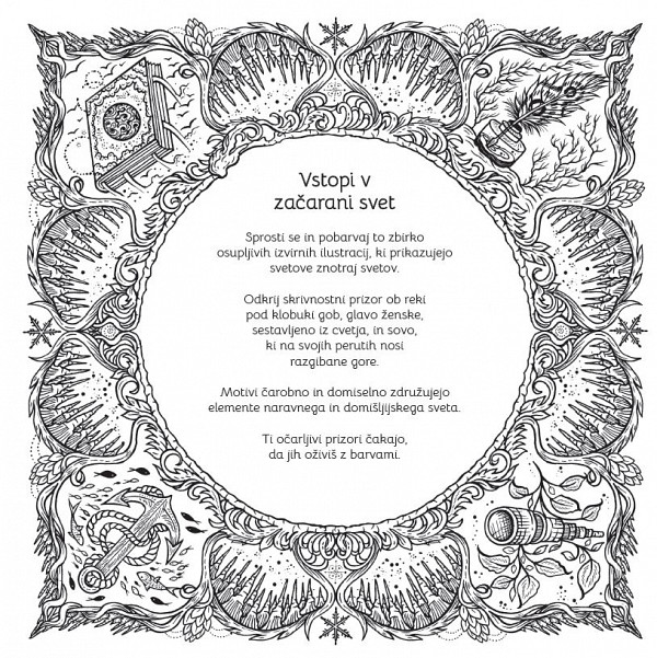Motivi čarobno in domiselno združujejo elemente naravnega in domišljijskega sveta. Ti očarljivi prizori čakajo, da jih oživiš z barvami.