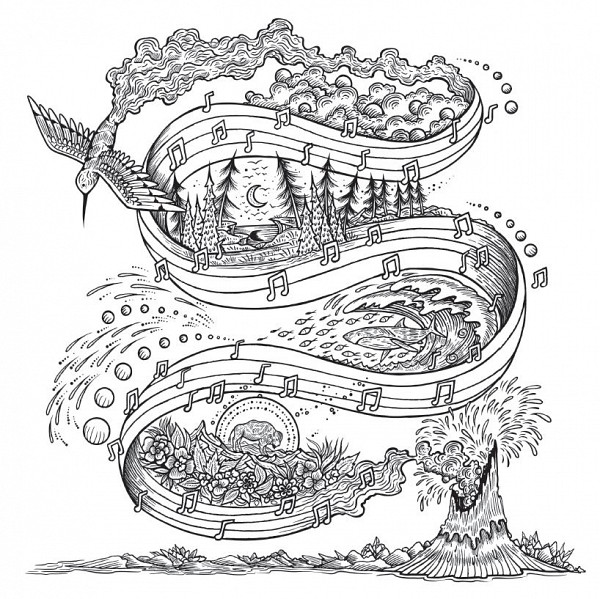 Odkrij skrivnostni prizor ob reki pod klobuki gob, glavo ženske, sestavljeno iz cvetja, in sovo, ki na svojih perutih nosi razgibane gore.