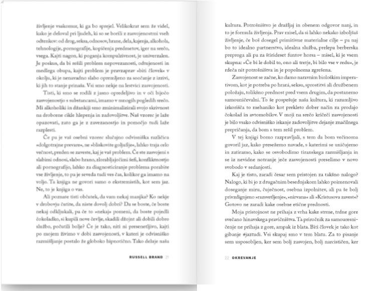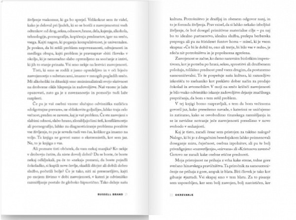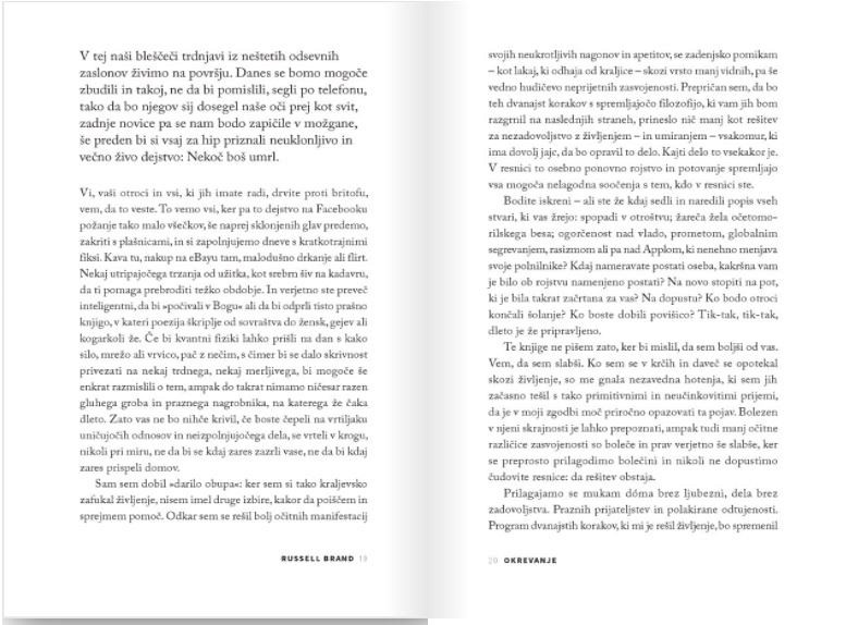 Komik in filmski zvezdnik Russell Brand črpa iz svoje divje življenjske zgodbe z edinstveno mešanico iskrenosti, humorja in sočutja, njegovi nasveti in modrost pa so plod štirinajstih let okrevanja. Knjiga je namenjena vsem, ki trpijo na kateremkoli delu celotnega spektra zasvojenosti – od drog, alkohola, kofeina in sladkorja do dela, stresa, slabih odnosov in digitalnih medijev.