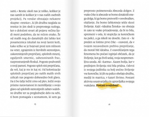 Zato si – še preden se lotimo prve črke – ozavesti, da v tvojem nezavednem prebiva prepričanje, da moraš biti idealna. Z ozaveščanjem tega fenomena bo počasi izginjal občutek, da je življenje, kot ga živiš sedaj, tvoja nespremenljiva usoda. Ali »karma«. Kazen božja, ker v prejšnjem življenju nisi bila pridna. Odvrzi iz svojega jedilnika za bolj srečno življenje vse korenčke, ki jih na palico obešajo družba, mediji in matrica, v kateri živimo. Postani aktivna soustvarjalka in upravljalka svojega vsakdana. Postani svodobna!