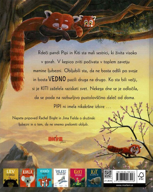 Napeta pripove Rachel Bright in Jima Fielda o družinski ljubezni in o tem, da ne smemo prelomiti obljub. Rdeči pandi Pipi in Kiti sta mali sestrici, ki živita visoko v gorah. V kepico zviti počivata v toplem zavetju mamine ljubezni. Obljubili sta, da ne bosta odšli po svoje in bosta vedno pazili druga na drugo. Preberite več