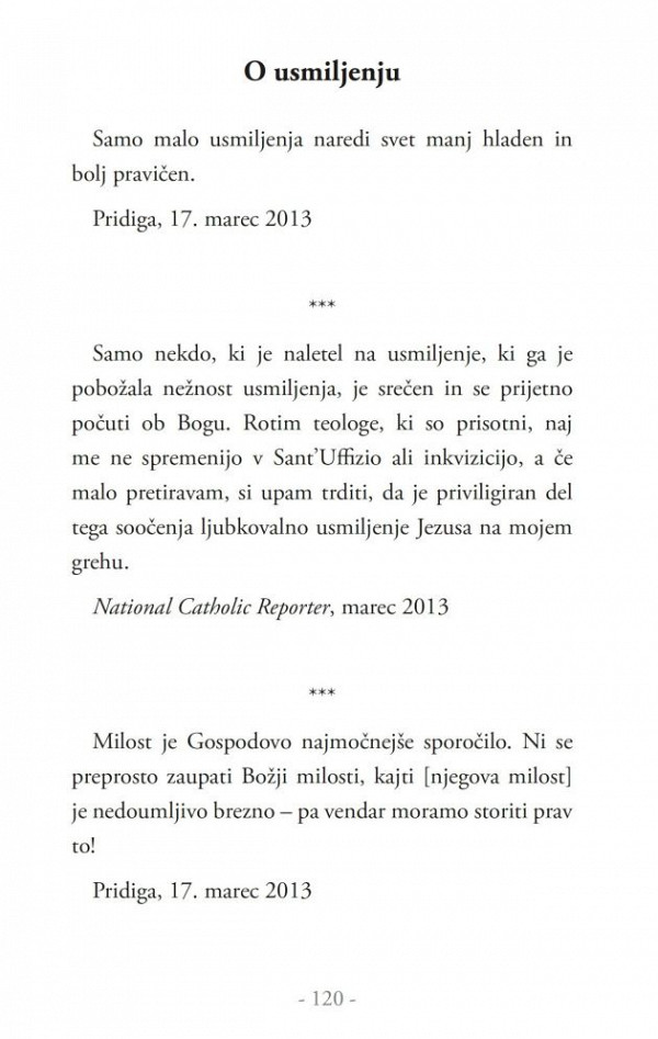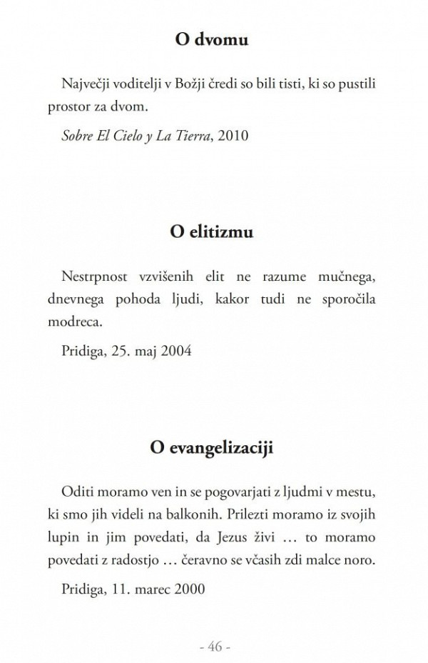 Knjiga Papež Frančišek v svojih besedah bo tako omogočila bralcu prav to, ob tem pa strnila njegove poglede ter misli v lepo zapakirane pakete, ki bodo omogočali vsem, da v trenutku spoznajo »Očeta Jorgea«. Iz knjige citatov, izrekov, nagovorov: