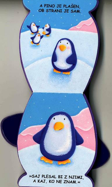 Knjiga Pingvin Pino je ena izmed štirih kartonk, ki sestavljajo čudovito in nenavadno serijo Knjiga, ki miga. Serija je namenjena otrokom starim do treh let in je nadvse nenavadna, tako po izdelavi kakor tudi po vsebini. Mojstrski prevod Jane Kolarič, pesnice in prevajalke, dá knjižicam še posebno iskrico. Knjižicam kartonkam z barvanim robom, čudovitih živih barv, ki se odpirajo navzgor, dajo še poseben čar šapice, tačke in peruti na zadnji strani, ki migajo gor in dol. Knjiga, ki miga je čudovita serija knjige in igračke, ki bo zagotovo zaživela prav v vseh otroških ročicah.Kartonka, 12 x 10 cm, 10 strani.