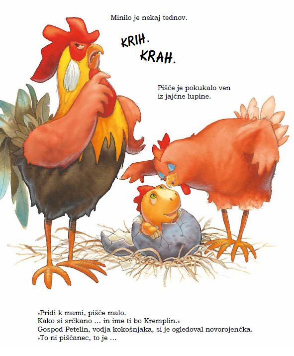 Čeprav ji gospod Petelin ves čas prigovarja, da to, kar se je izvalilo, ni piščanec, mama Kokoš vztraja pri svojem. Malo pišče pa raste … in poglej, vse bolj in bolj je podobno zmaju.