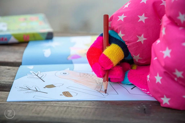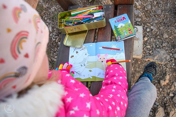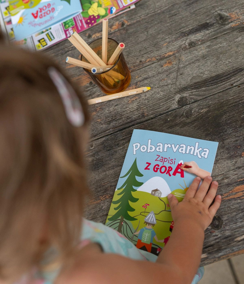 Prav posebna otroška pobarvanka Zapisi z gora. Spoznajte jo. Vsebuje prizore s planinskih poti, naših gozdov in živalskega sveta. Prirejena je po okusu mlajših umetnikov, ki velikokrat ne želijo izgubljati časa z barvanjem velikih površin, kot je nebo ali trava. Prav zato smo posamezne slike deloma zapolnili že mi, tako da se otroci lahko posvetijo živali, rastlin, planincev, označb ali gorniške opreme ter jih na ta način dodobra spoznajo.