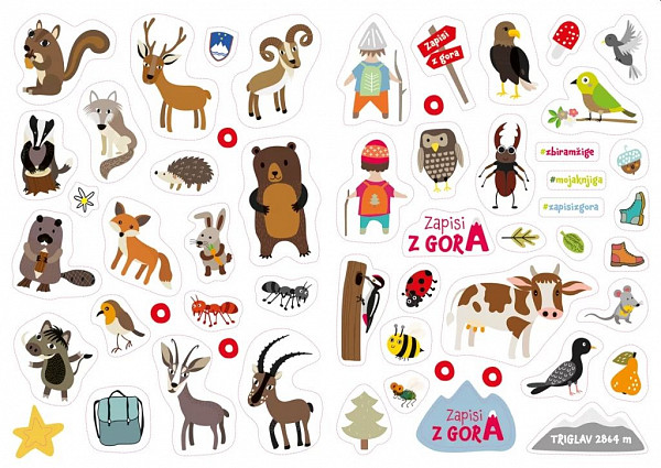 Na osrednjih straneh smo kot majhno presenečenje vključili 55 nalepk, ki jih otroci lahko nalepijo v pobarvanko ali pa jim najdejo mesto v planinskem dnevniku Prvi zapisi z gora. Služijo lahko kot vodilo pri izbiri barv med barvanjem samim.