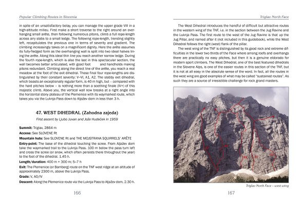 The choice of routes in the original book was governed by three criteria: aesthetic (the most important), historical and regional, and many alpinists were involved in the selection. Sadly, the author Tine Mihelič died in the Slovene mountains in 2004 and it is in his memory that this selection of the best known climbing routes in Slovenia has been prepared in collaboration with the two translators. "We trust that this guidebook in English will give visiting alpinists a small but satisfying foretaste of Slovenia's magnificent mountain world."