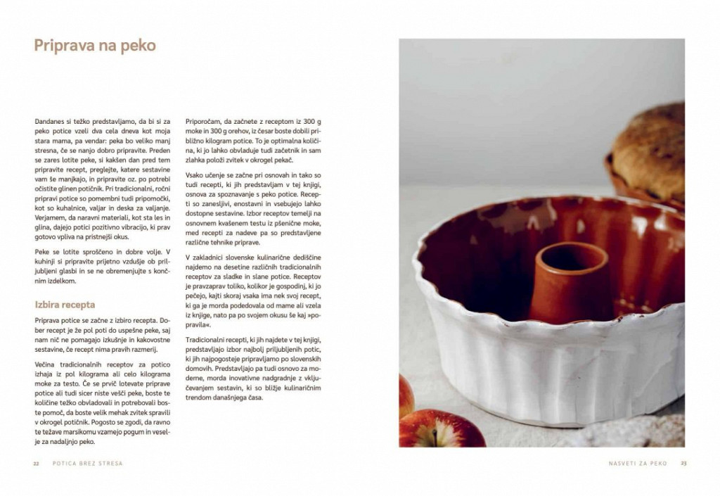 Knjiga Potica brez stresa razblinja mite o peki potice in nas po receptih iz pekarne lePotica, z lahkotnostjo popelje v svet slovenske kulinarične klasike. Ne glede na to, ali se s peko potice šele spoznavate ali pa iščete nove izzive, boste v knjigi našli kup praktičnih nasvetov in drobnih trikov, ki razblinjajo mit o zahtevnosti priprave potice.