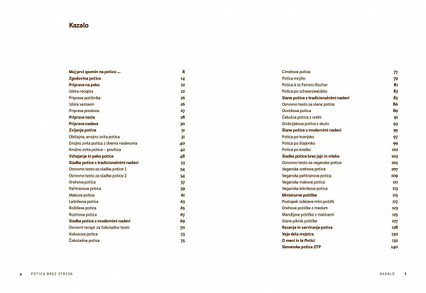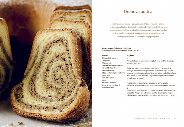 Knjiga ponuja več kot 30 receptov za tradicionalne sladke in slane potice, ki jih najpogosteje pripravljamo v slovenskih domovih. Predstavlja pa tudi recepte za moderne nadgradnje, ki so bližje kulinaričnim trendom današnjega časa. Ob več kot 100 fotografijah potic in postopkov priprave se vam bodo gotovo pocedile sline – in peka potice bo postala vaša nova strast.