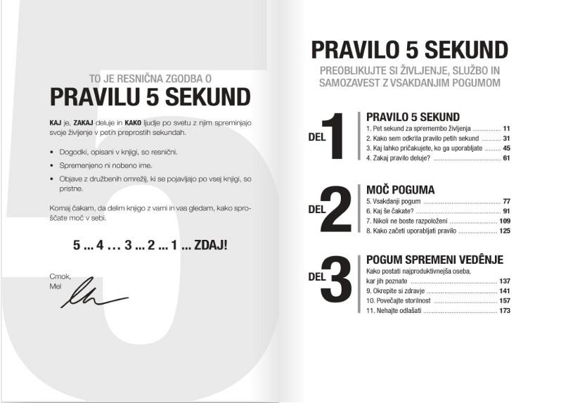 Pravilo 5 sekund pravi: Takoj ko vas prime, da bi ukrepali v zvezi z nekim ciljem, morate odštevati: 5 ... 4 … 3 ... 2 ... 1, in se zganiti, drugače vas bodo možgani ustavili.