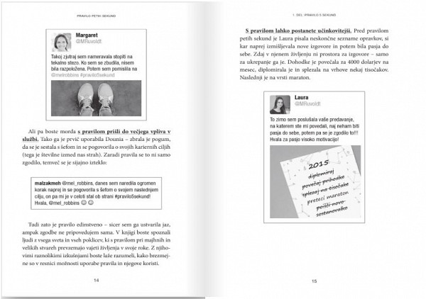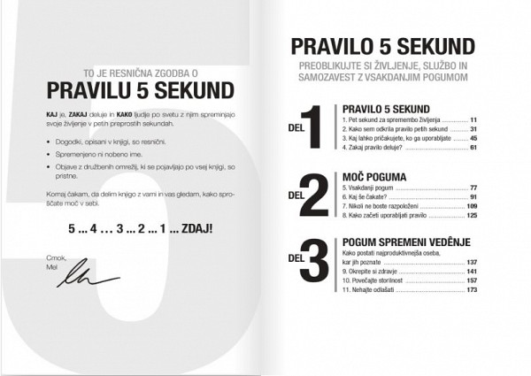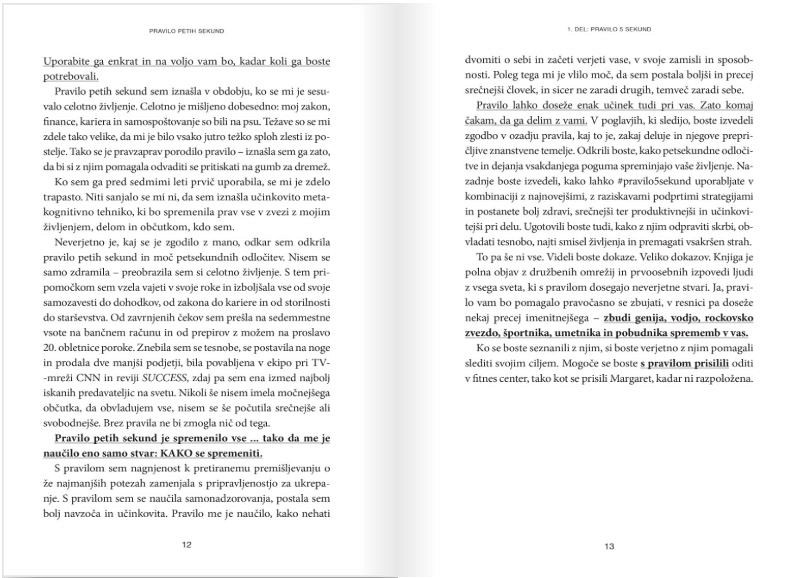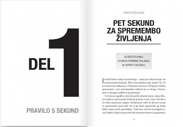 Če iščete človeka, ki vam bo spremenil življenje, se zazrite v ogledalo. Samo pet sekund traja, da si spremenite življenje. Sliši se kot kakšen trik, kajne? Ni. To je znanstveno dokazano. Življenje si lahko spremenite z eno petsekundno odločitvijo za drugo. Pravzaprav se drugače sploh ne spreminjate. To je prava zgodba o pravilu petih sekund: kaj je, zakaj deluje in kako je spremenilo življenja ljudi po vsem svetu. Pravila si ni težko zapomniti, njegov učinek pa je velik. Je skrivni recept za spremembo česar koli. Ko si ga boste zapomnili, ga boste lahko takoj začeli uporabljati. Vsak dan vam bo pomagalo živeti, ljubiti, delati in govoriti bolj samozavestno in pogumneje.