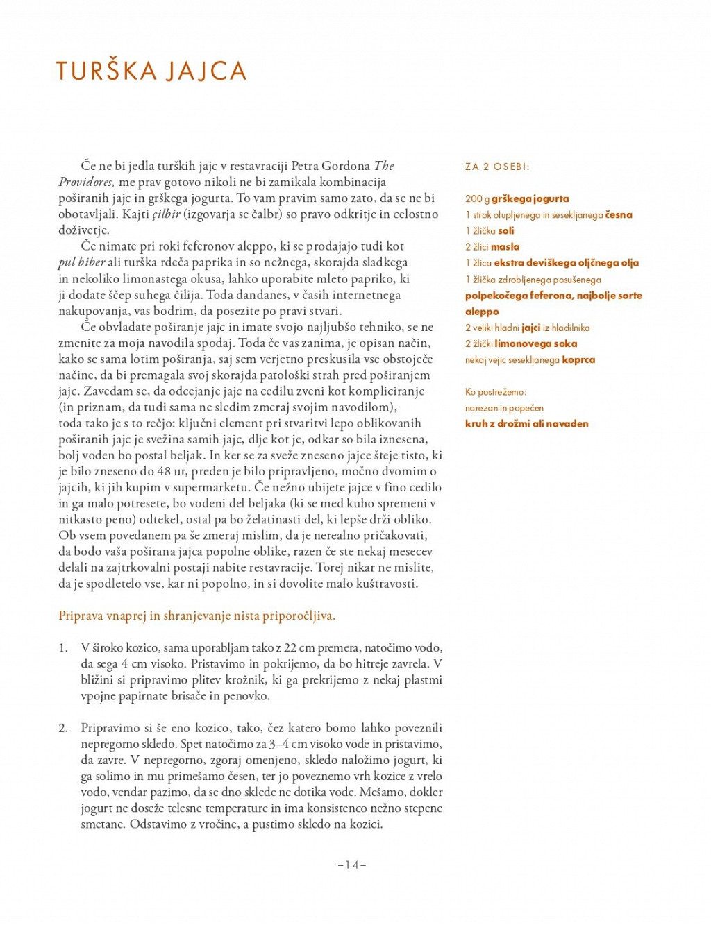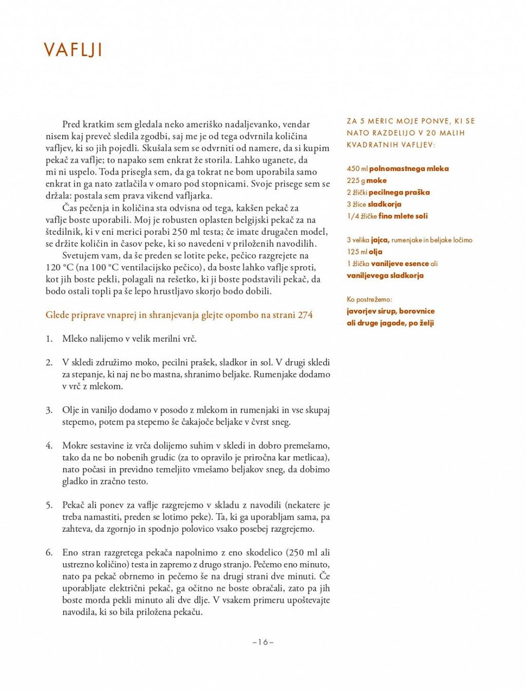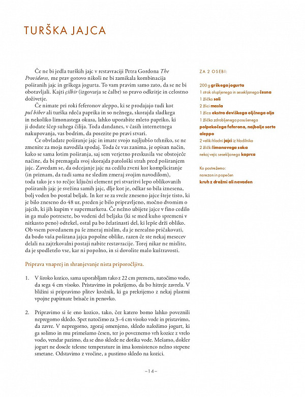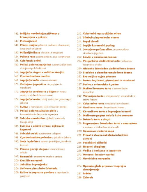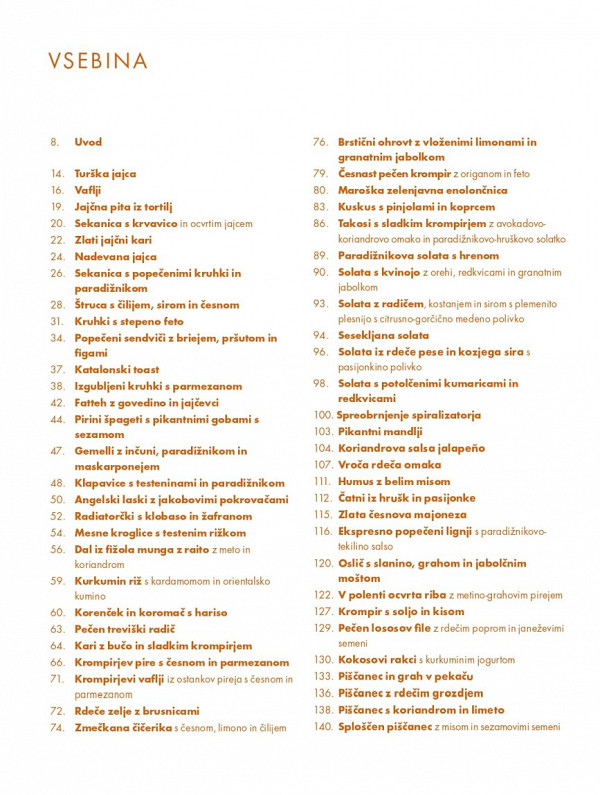 Več kot sto receptov v knjigi je poklon domači kuhinji. Razburljive zelenjavne jedi, enolončnice, dišeče pečenke, sanjske sladice in domiselne pijače, kari z bučo in sladkim krompirjem, piščančji ričet, svinjina s suhimi slivami, oljkami in kaprami, rožna in poprasta pavlova z jagodami, piškoti z dvojno čokolado in bučnimi semeni, grenivkina margarita…