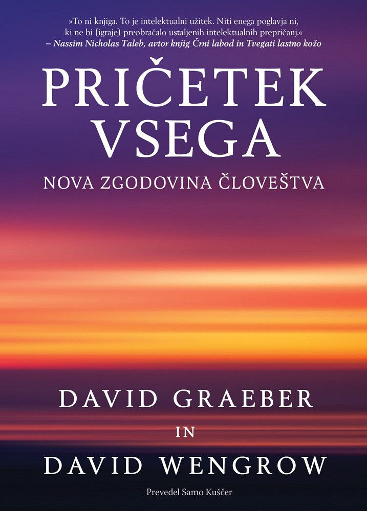 »V tej knjigi skušamo nastaviti drugačno, svetlejšo in zanimivejšo pripoved, ki hkrati popolneje upošteva odkritja v zadnjih nekaj desetletjih. Deloma gre za sestavljanje podatkov, ki so se nakopičili v arheologiji, antropologiji in sorodnih vedah – podatkov, ki kažejo na povsem drugačno podobo razvoja človeške družbe v obdobju zadnjih približno 30.000 let. Skoraj vse nove ugotovitve spodbijajo običajno podajanje zgodovine, vendar najzanimivejša odkritja vse prepogosto ostajajo omejena na delo strokovnjakov ali pa se je do njih treba prebiti z branjem med vrsticami objavljenih del v strokovnih revijah.«