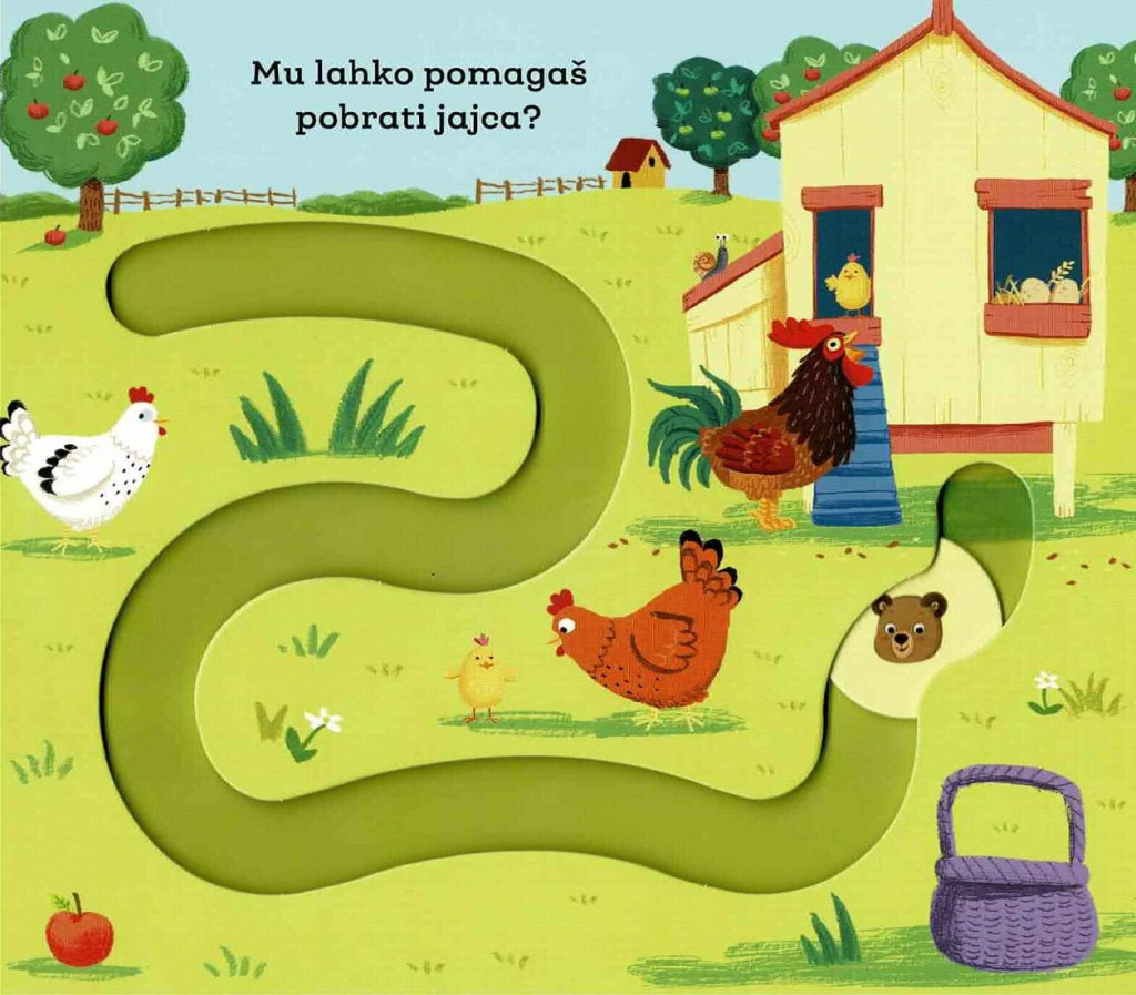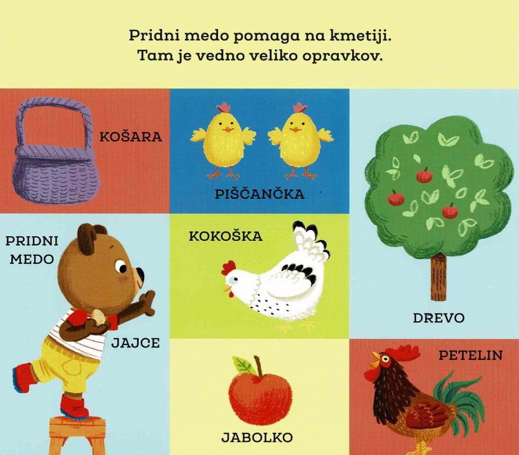 Pridni medo pomaga na kmetiji. Tam je vedno veliko opravkov. Preberi, kaj se na kmetiji dogaja in pomagaj pridnemu medu z DRSNIKI raziskati kmetijo.