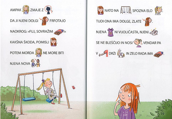 Stavki so kratki, s preprosto strukturo, besedišče je preprosto in prirejeno za bralce – začetnike. Knjiga je opremljena s piktogrami, pisana z velikimi tiskanimi črkami, na koncu pa je dodan še slovarček.