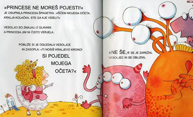 Kaj jedo vesoljci za večerjo? Kralje? Ne! Princese? Ne! Čokolado? Hmm ...Izstrelite se v vesolje s princeso špagetko in doživite nepozabno avanturo!Trda vezava, 25,5 x 28 cm, 26 strani.