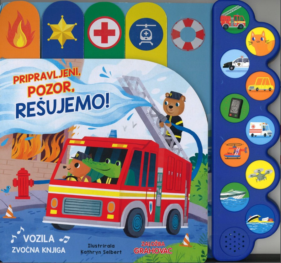 Na pomoč prihajajo reševalna vozila. Otroci bodo med pritiskanjem na gumbe z veseljem poslušali zvoke, ki jih oddajajo.Kartonka z zvočnim mehanizmom, 270 x 283 mm, 10 strani.