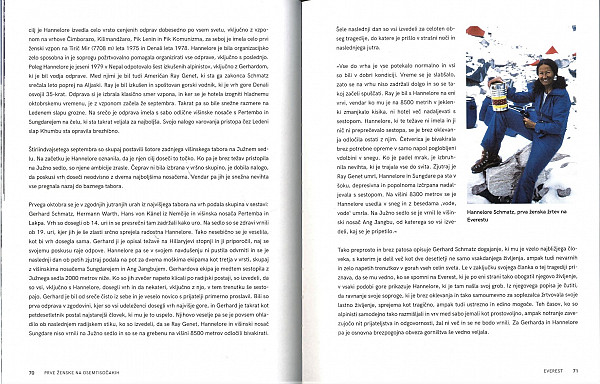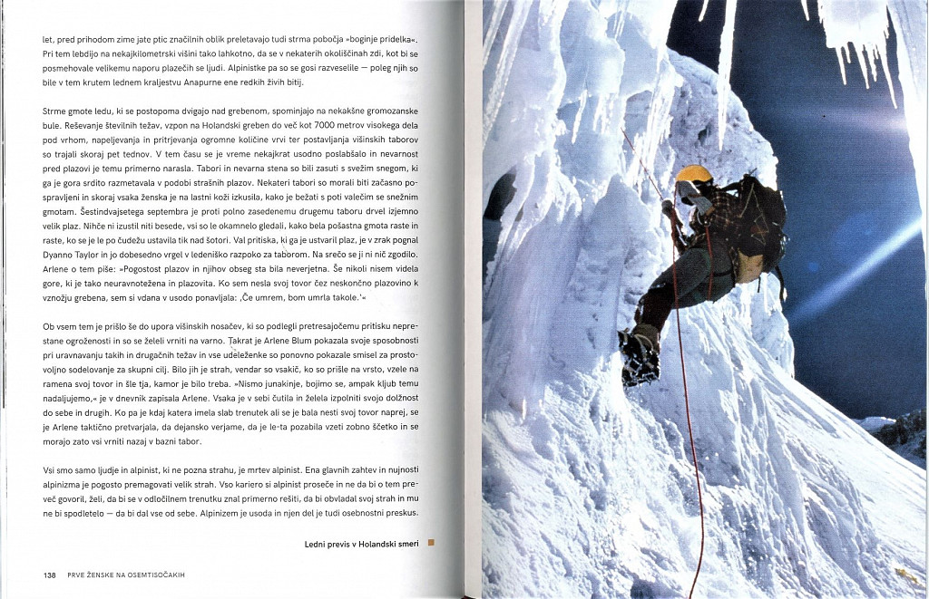 Ta knjiga v prvi vrsti opisuje zgodovino ženskega osvajanja vseh osemtisočakov, vendar se ne izogiba geografskim, verskim ali političnim vprašanjem, ki k eksotiki visokogorskega alpinizma nedvomno sodijo. Na zelo berljiv in verodostojen način so opisane tako neverjetne zgodbe posameznih akterk, najsi so bile uspešne ali neuspešne, kot tudi burne spremembe, ki jih je gorništvo doživljalo v zadnjem času.