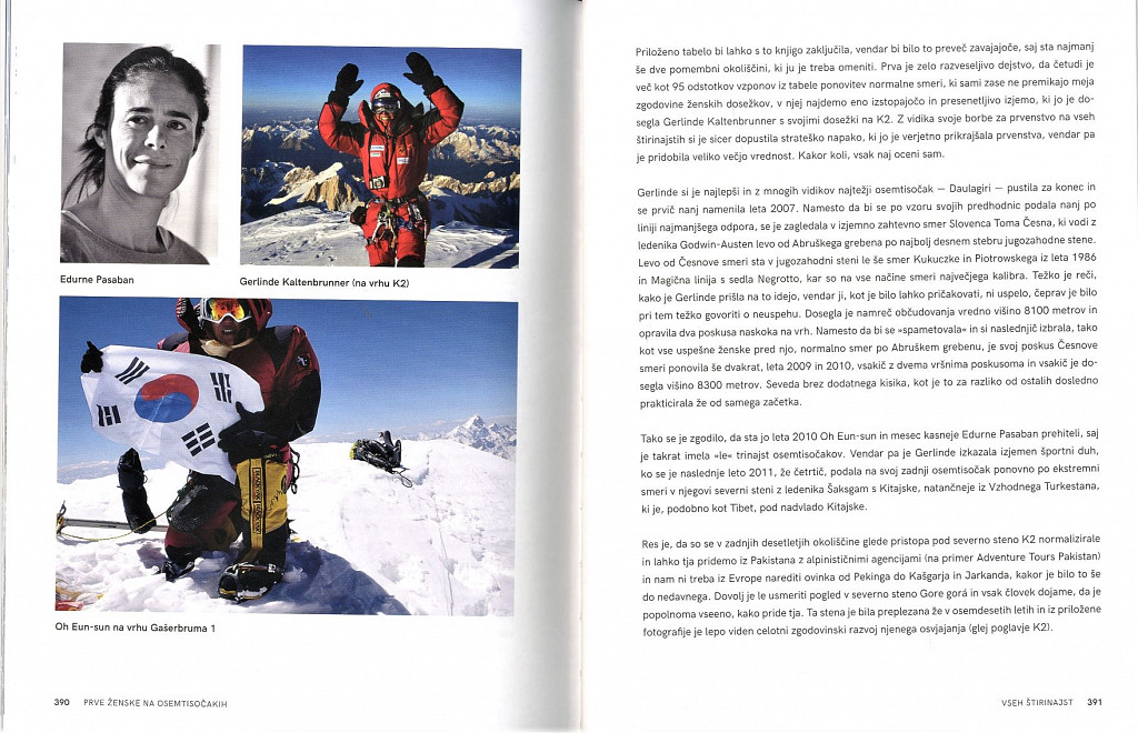 "Žensko vrhunsko plezanje na velikih višinah sledi povsem enakim ciljem kot moško. To je, opraviti vzpon čim višje težavnostne stopnje na čim višji nadmorski višini. Če je le mogoče, po novi smeri in v alpskem slogu. Čeprav je celotni svetovni himalajizem, razen res redkih izjem, trenutno v krizi, smo Slovenci trdno zasidrani v njegovem najožjem vrhu. In da ne bo dvomov, Slovenke tudi. Upam in verjamem, da bo tako tudi v prihodnje. Prav vsem omenjenim slovenskim alpinistkam, plezalkam, himalajkam in pustolovkam v pričujočem zapisu, gre zahvala za to." - Viki Grošelj