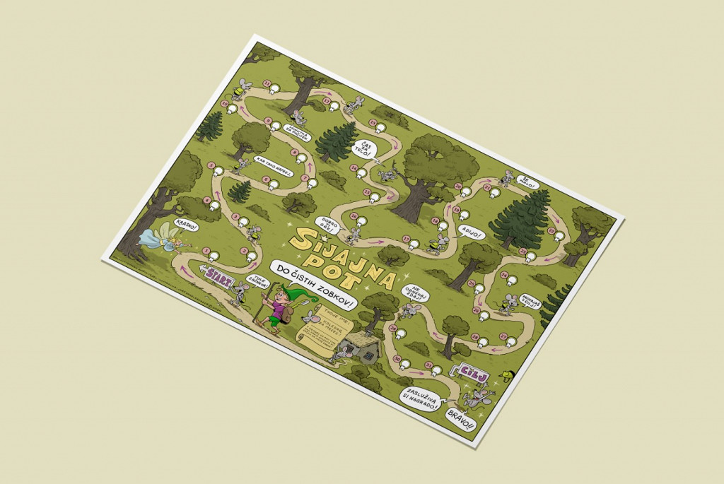 2. “Sijajna pot do čistih zobkov”: V okviru vzgoje za samostojnost in odgovornost pri ustni higieni beležnik “Sijajna pot do mlečnih zobkov” otrokom omogoča, da v prazne prostore vrisujejo poljubne ikonice kot znak svoje zavezanosti rednemu umivanju zob in po potrebi nitkanju. Zobni škrat Svetlin “nadzira” njihova prizadevanja in jim za vztrajnost, pogum in odlično sodelovanje s starši podeljuje Diplomo Zobnega škrata Svetlina Sijajnega za čiste zobke.