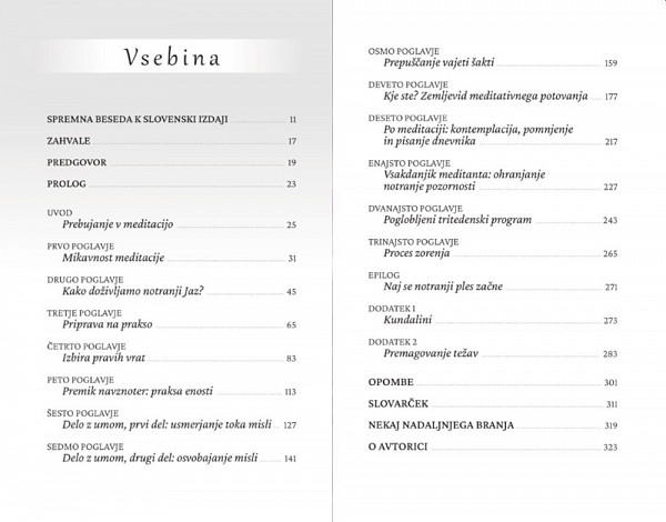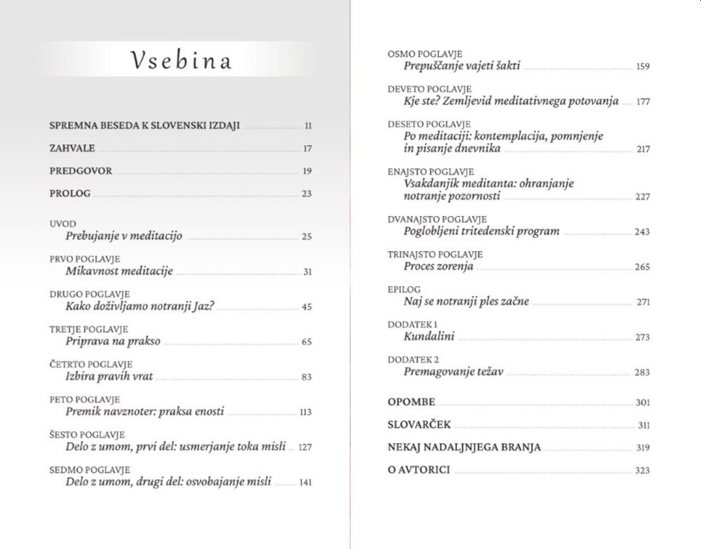 »Meditacija je temelj vsakršnega dela na sebi. Lahko se še tako vestno trudimo presegati svoje omejitve, se izdatno opremljamo z navodili in si pridobimo vsakršno možno pomoč – na koncu bo le neposredno, golo srečanje z našim lastnim Zavedanjem tisto, zaradi česar bomo drugače pogledali nase in dobili moč zavzeti trdno držo, izhajajoč iz osrčja našega bitja. Nihče drug nam ne more omogočiti tega. Ta vrata nam odpira le meditacija. «