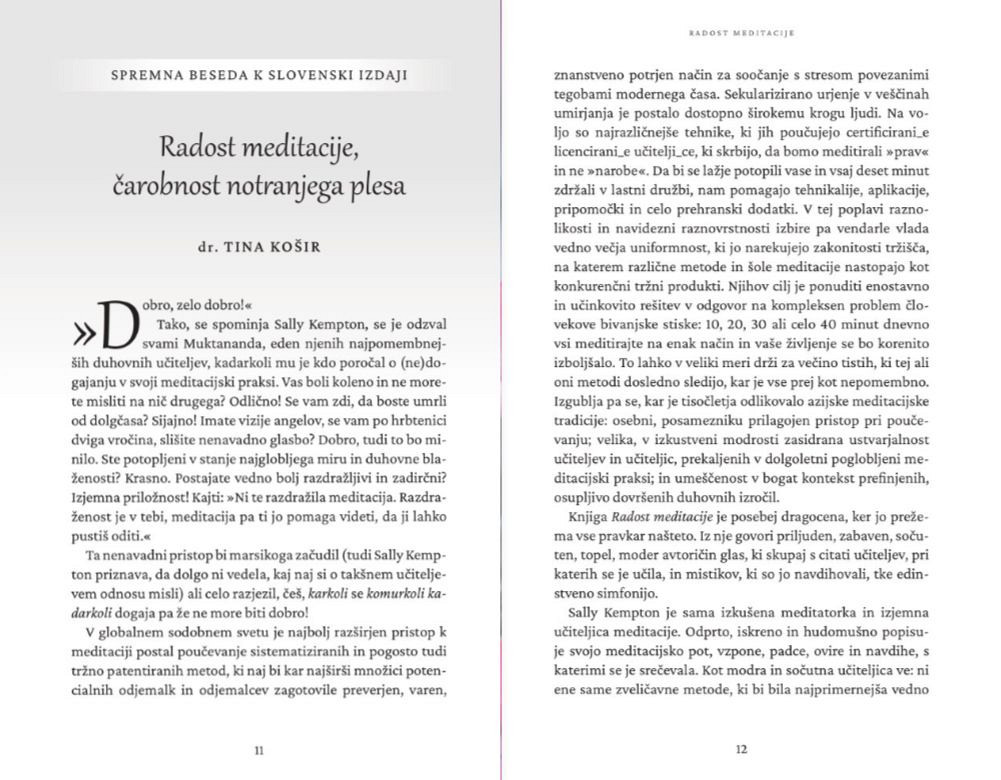 V knjigi Radost meditacije nam avtorica Sally Kempton zaupa, kako si lahko z meditacijo pomagamo do brezpogojnega objema polnosti našega doživljanja – tako na meditativni blazini kot v vsakdanjem življenju. Z nevsiljivo modrostjo in sočutjem nekoga, ki razume tegobe meditacijske prakse, nam približa radost pohajkovanja po globokih in skrivnostnih predelih srca, uma in telesa.