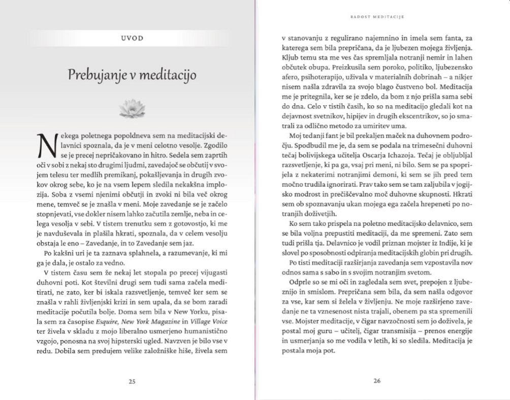 - »Iskrena hvala za knjigo Radost meditacije. Gre za toplo in prijazno knjigo za takojšnjo uporabo – pomagala bo številnim ljudem in se dotaknila prenekaterih src.« - ROBERT A. JOHNSON, avtor knjig Midva, Ona in On