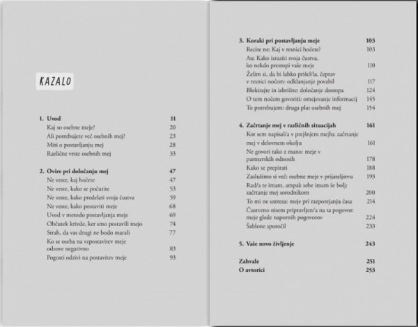 Že od malega nas učijo, da moramo potrebam drugih dati prednost pred svojimi. Pogosto pa nam zaradi tega ostane le malo časa in energije za skrb zase in raziskovanje, kdo v resnici smo in kaj si želimo. Michelle Elman vas bo naučila, kako lahko življenje spet vzamete v svoje roke, tako da se naučite postavljanja mej. Določanje in uveljavljanje osebnih mej sta praktična plat ljubezni do sebe; s tem ljudi naučite, kako naj ravnajo z vami, odidete iz zastrupljajočih odnosov in končno začutite, da imate sebe ter druge lahko pristno radi.
