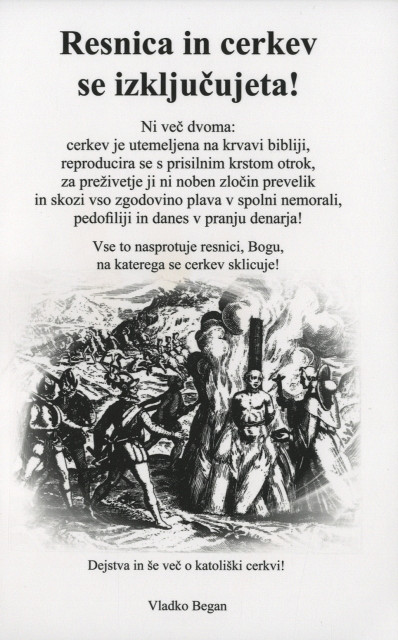 »Dejstva in še več o katoliški cerkvi. Ni več dvoma: cerkev je utemeljena na krvavi bibiliji, reproducira se s prisilnim krstom otrok, za preživetje ji ni noben zločin prevelik in skozi vso zgodovino plava v spolni nemorali, pedofiliji in danes v pranju denarja!Vse to nasprotuje resnici, Bogu, na katerega se cerkev sklicuje!« Vladko BeganMehka vezava, 13 x 20 cm, 206 strani.