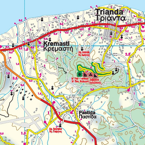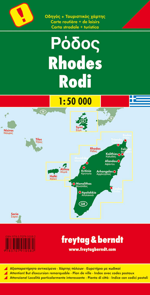 Na avtokarti Rodosa v merilu 1:50.000 je na voljo še veliko dodatnih informacij: turistične znamenitosti, nacionalni parki, kampi, kolesarske steze in načrti ključnih mestnih središč (glavno mesto Rodos). Poleg tega mestni register s poštnimi številkami omogoča hitro usmeritev. Preberite več