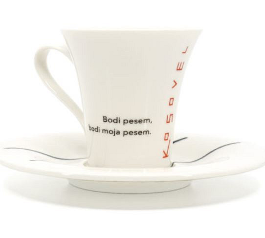 Na voljo so tri različne majhne skodelice s poezijo Kosovela: "Bodi pesem", "Iz njenega srca", "Vetrovi svetli".