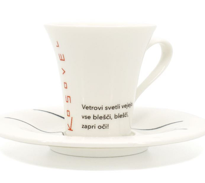 Na voljo so tri različne majhne skodelice s poezijo Kosovela: "Bodi pesem", "Iz njenega srca", "Vetrovi svetli".