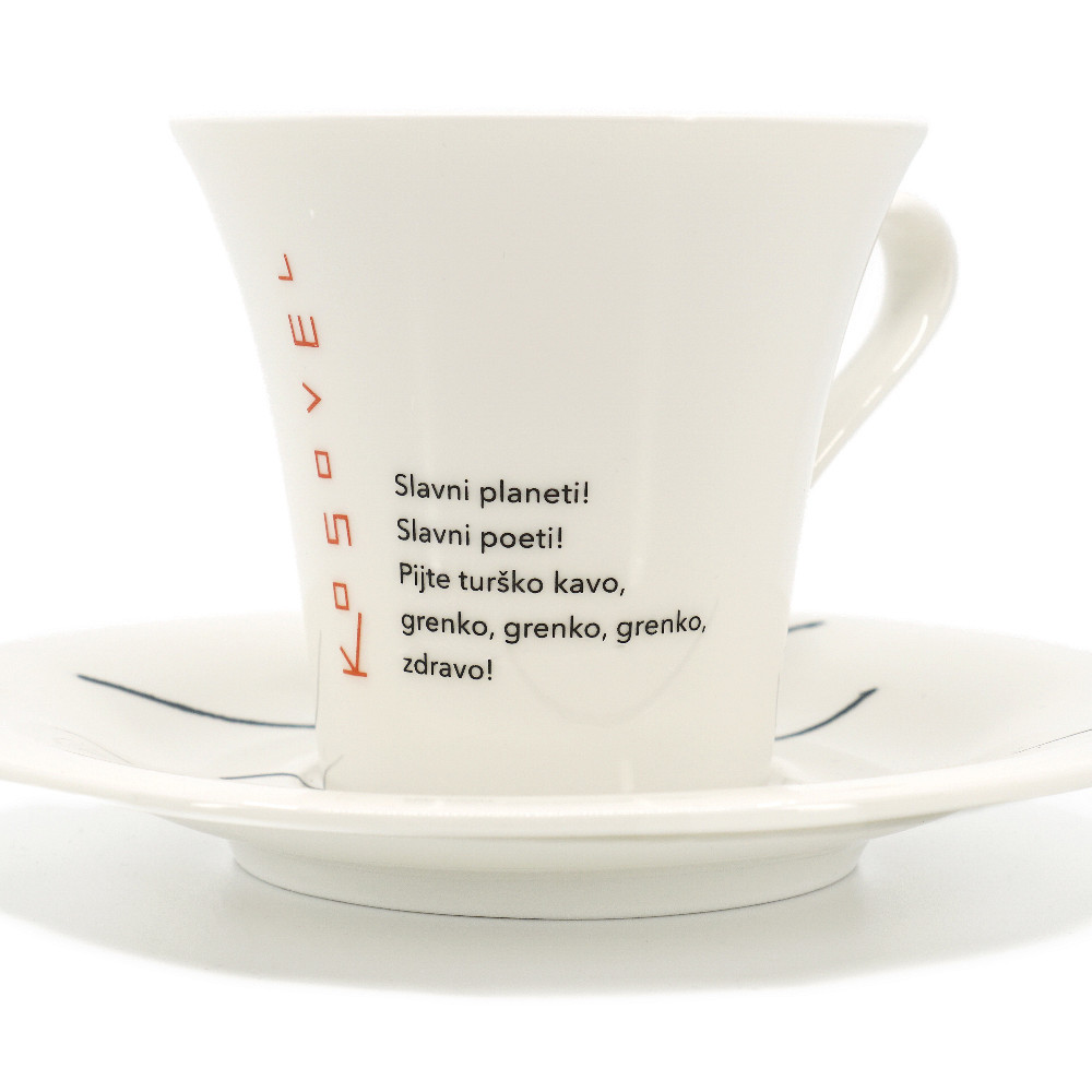 Na voljo so tri različne velike skodelice s poezijo Kosovela: "Jaz žarim", "Slavni planeti", "Sveča dogoreva".
