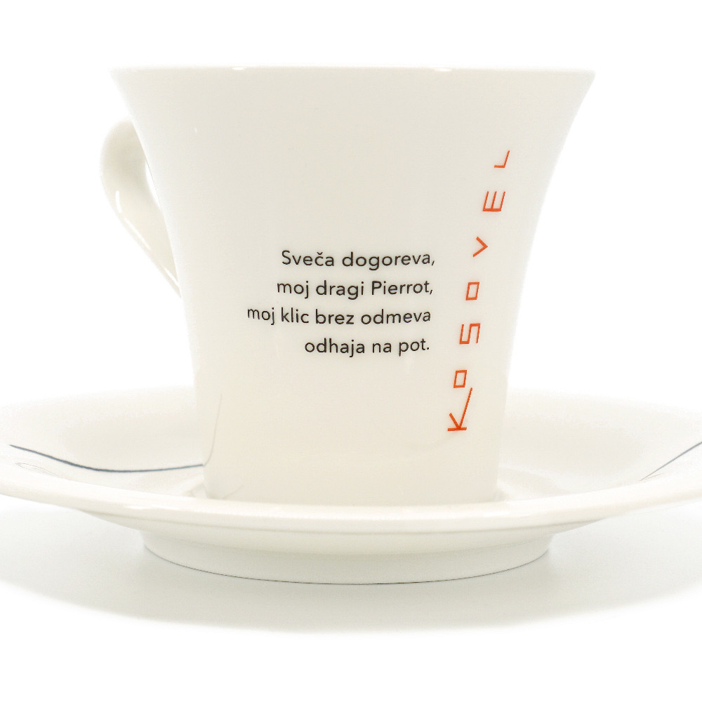 Na voljo so tri različne velike skodelice s poezijo Kosovela: "Jaz žarim", "Slavni planeti", "Sveča dogoreva".