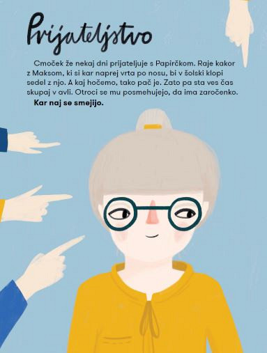Ko se Cmoček in Anja spoprijateljita, nekateri strahovi izginejo, drugi so premagani. Tudi tisti, ki jih skrivaj občuti Cmočkova mama. Anna Onichimowska nas skozi zgodbo o prijateljstvu med dečkom in deklico popelje skozi proces premagovanja strahu.