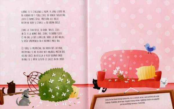 Namen knjige je na igriv način v otrocih vzbuditi občutek odgovornosti do hišnih ljubljenčkov ter živali nasploh. Pesmi so opremljene z barvitimi ilustracijami, ki naredijo pesmice še bolj doživete, na koncu vsake pa je skrit oblaček z nasvetom za starše.