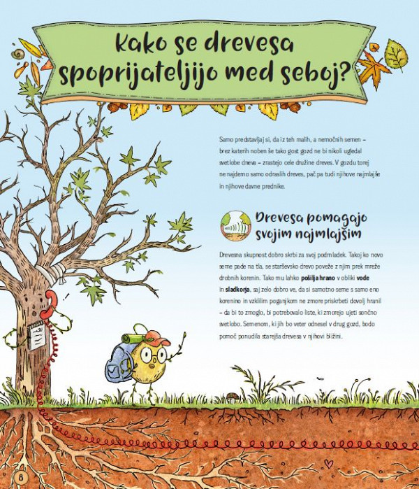 Tako kot ljudje tudi ona dihajo, so lačna ali žejna. Imajo družine, ki varujejo svoja drobcena semena, pa tudi prijatelje, s katerimi si med seboj pomagajo, kadar je to potrebno. Na prvi pogled se morda zdi, da so povezave med prebivalci gozda – drevesi, mravljami, pticami, glivami in drugimi – prepletene kot ptičje gnezdo, a če pogledaš pobliže, boš ugotovil, da živijo skupaj v nevidni harmoniji. Kako je to mogoče?