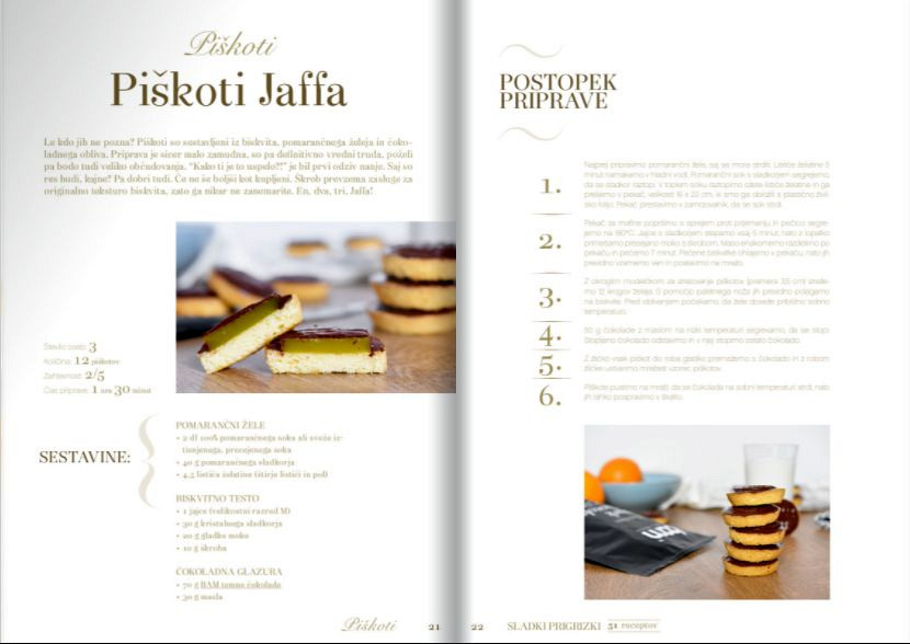 BAM knjiga receptov "Sladki prigrizki" v prvem poglavju ponuja recepte za pripravo različnih vrst piškotov. Pripravite popularne ameriške piškote, medenjake, slavne linške piškote ali sočne jaffa piškote, v katere bo vsak z veseljem ugriznil. Vaša jutra ob skodelici kave ali čaja bodo s piškoti po teh receptih zagotovo še slajša. Nadaljujete na poglavje z več kot desetimi različnimi recepti za pripravo sladic v kozarcih. Razpon različnih kombinacij okusov sega vse od klasičnega čokoladnega belega moussa z jagodami do čokoladnega Baileys-a v kozarcu. Na koncu vstopite še v svet priprave drobnega peciva, kjer najdete mešanico trandicionalnih receptov v kombinaciji različnih stuktur in okusov drobnega peciva.