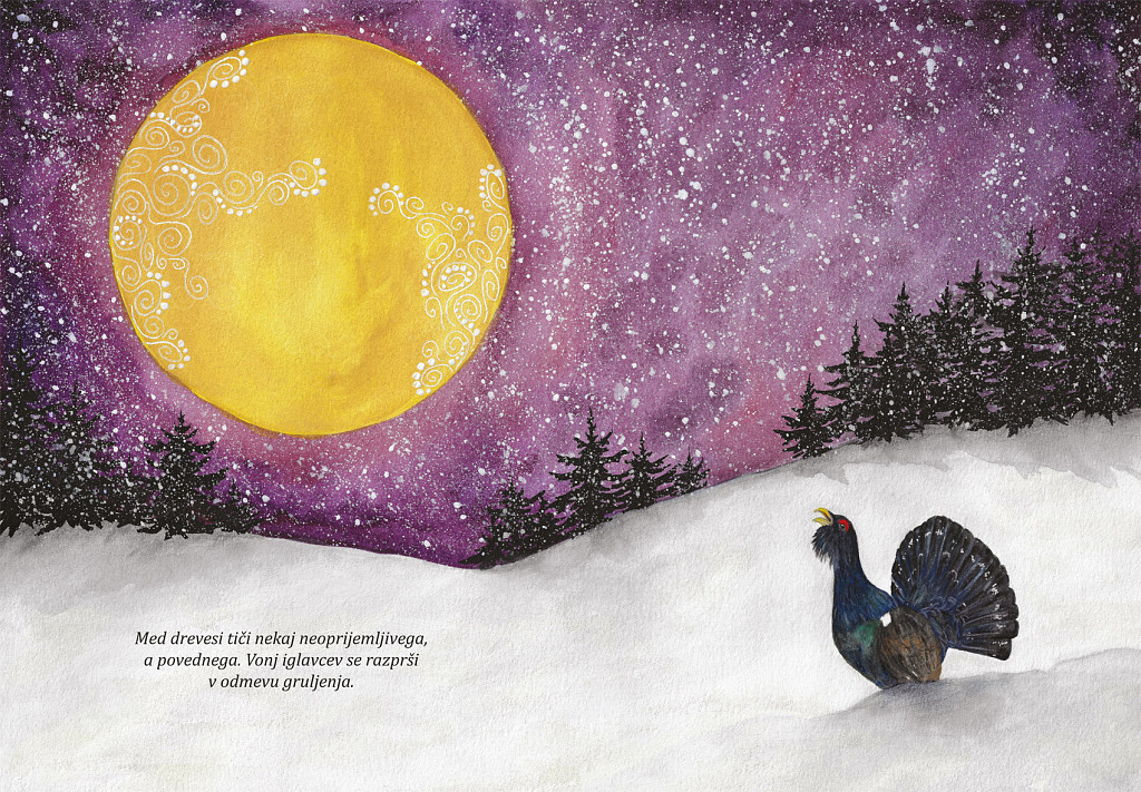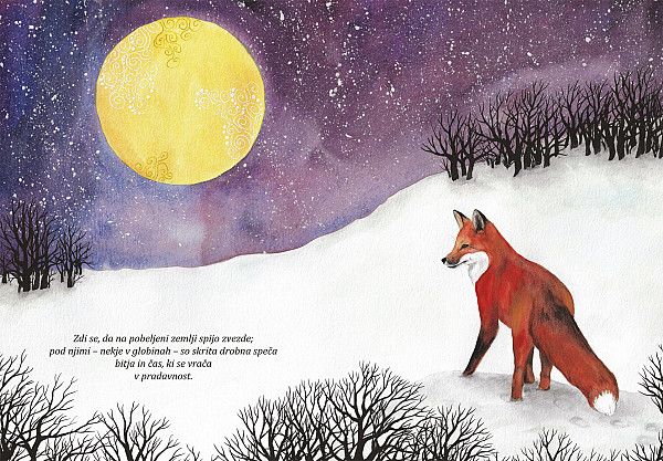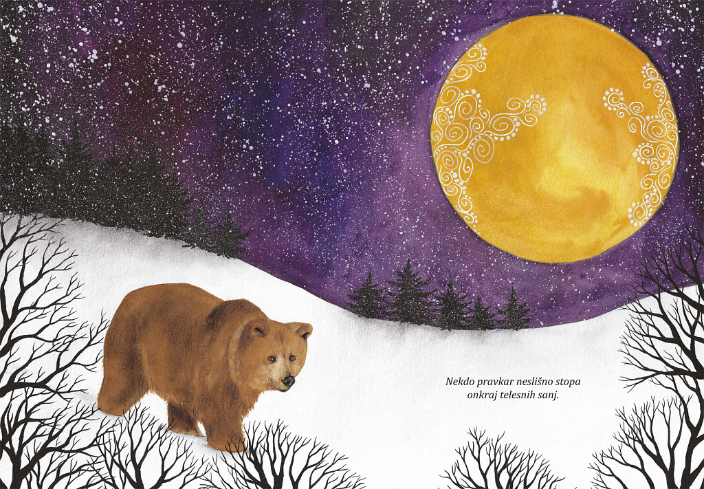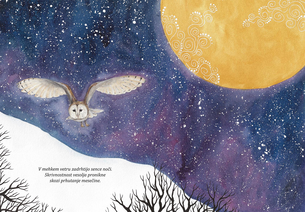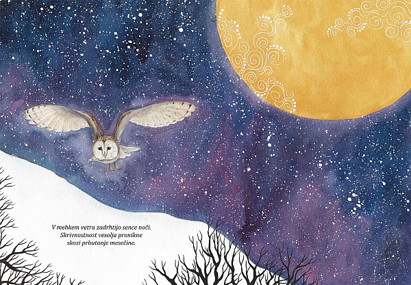 Zdi se, kot bi svoje besedilo tkala iz dragocenih in na videz rahlih, a obenem zelo obstojnih niti, ki se z blagostjo dotaknejo bralčevega notranjega sveta in sežejo v jedro neizrekljivega.Celoto krasijo avtoričine ilustracije, ki so v popolni harmoniji z besedilom. Kot stalnice na poti skozi lirično besedilo nas spremljajo mehkost zasnežene pokrajine, črne silhuete dreves in velika rumena luna z belimi okrasi. To, kar se spreminja, je predvsem barva neba, ki variira od temno modre do vijolične. Prav tako pa se na vsaki risbi srečamo z drugo gozdno živaljo.