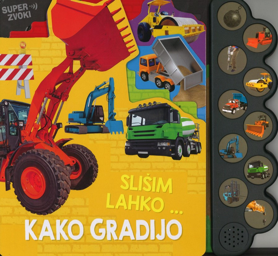Otroci se bodo s pomočjo te živahne knjige, polne fotografij, z veseljem učili o gradbenih strojih in zvokih, ki jih lahko slišimo na gradbišču.Kartonka z zvočnim mehanizmom, 270 x 283 mm, 10 strani.