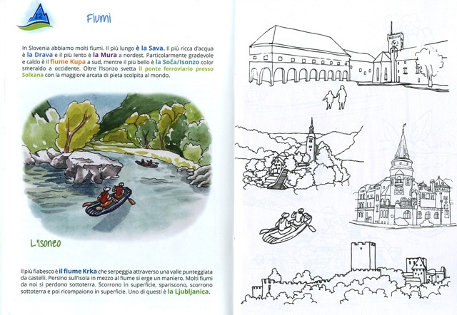 Otroci bodo s pomočjo Alenke in Anzeja raziskali Slovenijo. Popeljala vas bosta skozi zgodovino Slovenije, predstavila njena večja mesta in njihove znamenitosti, jezera, reke, planine. Naštela vam bosta nekaj znamenitih Slovencev, od Franceta Prešerna do Ivane Kobilice.Knjiga je napisana v ITALIJANSKEM jeziku.Mehka vezava, 21 x 29,5 cm, 26 strani.