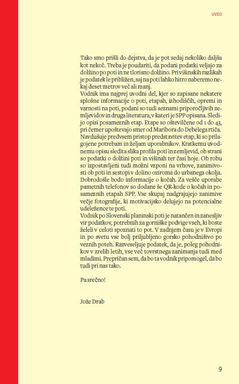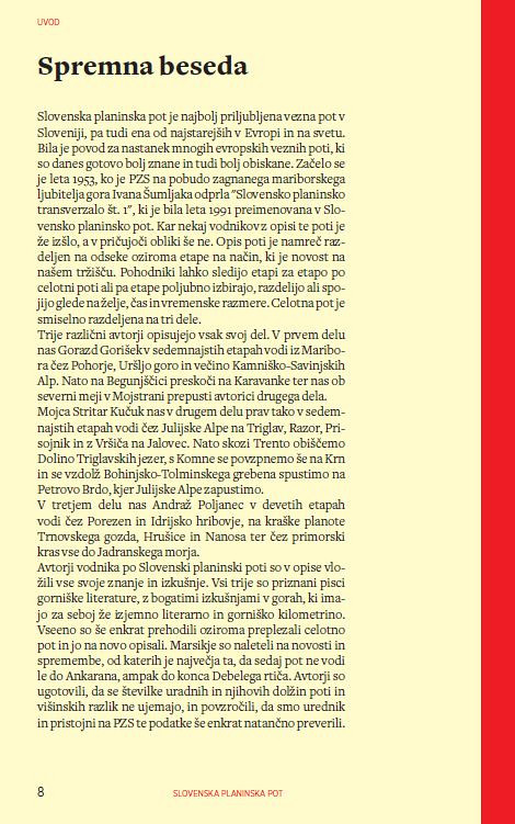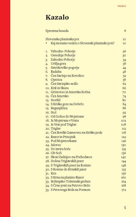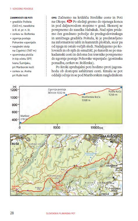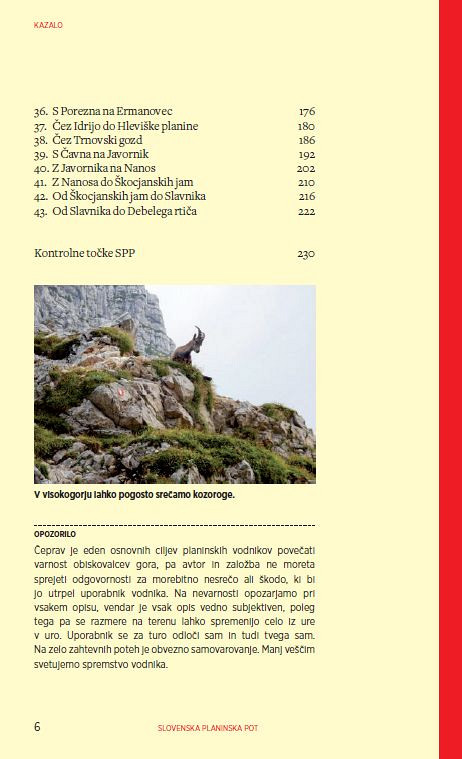 Dopisani so možni vzponi na vrhove ob poti, ki ne sodijo v Slovensko planinsko pot ter možni sestopi v dolino. Razveseljiv je kratek seznam naravnih in kulturnih znamenitosti ob poti, za lažjo pripravo pa je vsaki etapi dodan profil poti ter jasno označena pot na izseku planinskega zemljevida. Navedeni so še osnovni in kontaktni podatki o planinskih kočah na poti.